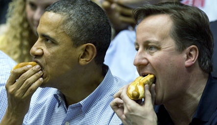 The Sunday Roast – Pasties, Petrol and a Queen Singing Parrot » Barack Obama and David Cameron eat hot dogs as they sit in the stands at University of Dayton Arena